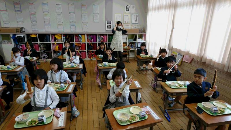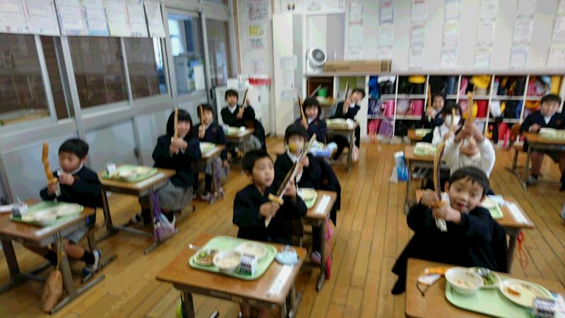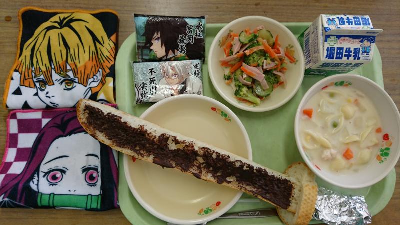 今日の献立は、節分メニューの第二弾、鬼滅の刃に出てくる鬼退治の道具「日輪刀」をイメージしたパン、クリームシチュー、ブロッコリサラダでした。日輪刀パンの食缶のふたを開けた瞬間、1,2年生の教室では歓声が上がりました。フランスパンを縦に細長く切って、1.5㌢の輪切りにしたものを鍔としてはめ、刃の部分にチョコを塗りました。