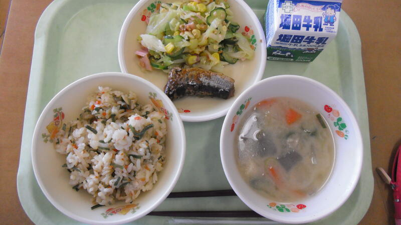 今日の献立は、おにぎり、あじの塩焼き、即席漬け、みそ汁でした。今日の給食は日本で最初の給食をイメージしてあります。今から133年前の明治22年、山形県の小学校で、お弁当を持ってくることができない貧しい子どもたちのために、おにぎりとめざし、漬物が出されたのが給食の始まりです。