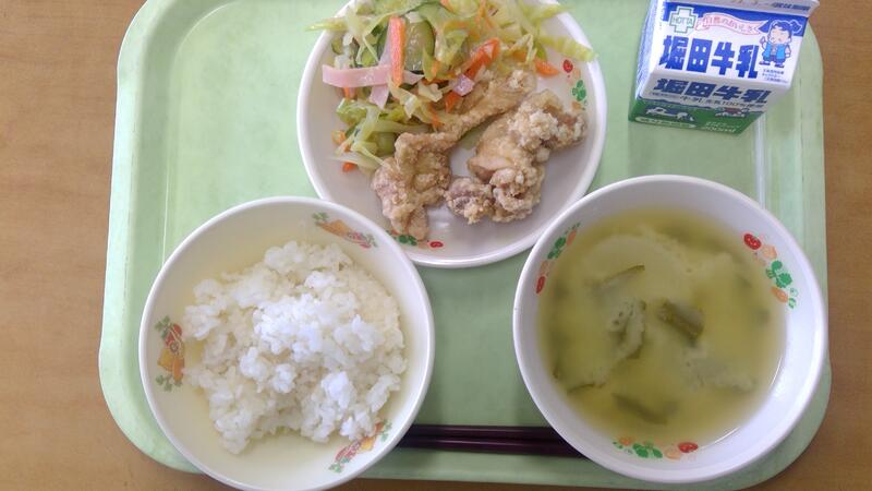 今日の献立は、麦ごはん、鶏の唐揚げ、ドレッシングサラダ、みそ汁でした。みんなが大好きな鶏の唐揚げ。「2個では足りません。」「また出してください。」「昨日のおうちのばんごはんも唐揚げでした!」と大人気でした。給食の唐揚げは、塩こしょう、淡口しょうゆ、酒、にんにく、しょうがで下味をつけて、小麦粉と片栗粉をまぜたものをまぶして揚げます。