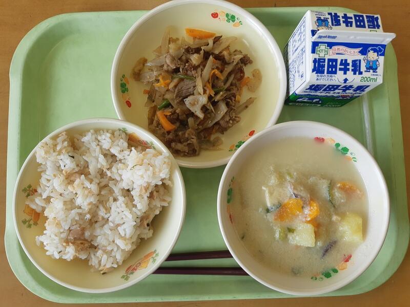7月12日(水)梅シーチキンごはん、牛乳、変わりきんぴら、具だくさん呉汁