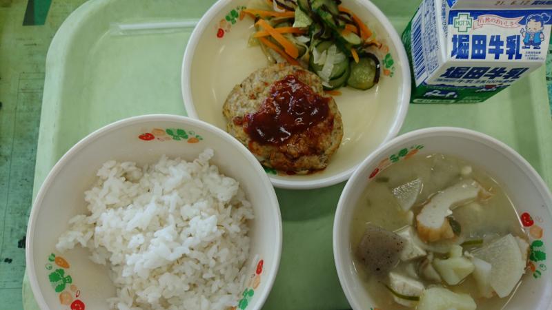 今日の献立は、麦ご飯、さばバーグ、即席漬け、根菜汁でした。さばバーグはさばの水煮缶詰と豆腐、野菜のハンバーグで、現中1の四人の子どもたちが考案しました。魚の臭みを消すために生姜と味噌を少々入れるのがポイントで、焼き上がりにケチャップソースをかけると、肉のハンバーグとほぼ変わりません。