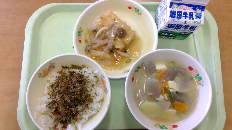 今日の献立は、麦ごはん、手作りふりかけ、揚げ出し豆腐、豚汁でした。今日の手作りふりかけは、いつものちりめんではなく、出しいりこをミキサーにかけて粉末にし、糸かつおとごまと一緒にから炒りして砂糖醤油をからめました。カルシウムがたっぷりです。