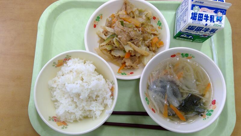 今日の献立は、ごはん、回鍋肉(ホイコーロー)、わかめスープでした。子どもたちに大人気の回鍋肉。どのクラスもおかわりの列ができていました。白ご飯によく合うおかずで、ほぼ全員時間内に食べ終えることができました。
