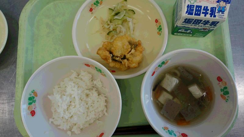 今日の献立は、ごはん、はもの天ぷら、香味和え、けんちん汁でした。はもは、大矢野でとれたものです。