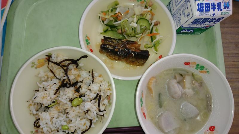 今日の献立は、枝豆昆布ごはん(ちりめん入り)、いわしのかぼすレモン、かみかみあえ、根菜汁でした。11月8日は「118(いい歯)の日」です。今日は、かみかみ食材の枝豆、昆布、さきいか、ごぼう、れんこん、そして歯にいいカルシウムたっぷりのいわしを取り入れました。