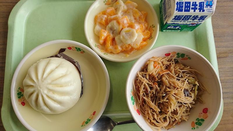 今日の献立は、肉まん(低、中学年は小籠包)、ソースビーフン、フルーツヨーグルトでした。コンビニサイズの肉まんはとても食べごたえがありました。1年生の中には「小籠包を初めて食べました!」という子どもたちも多数いました。かぶりつくと肉汁があふれてきておいしそうでした。