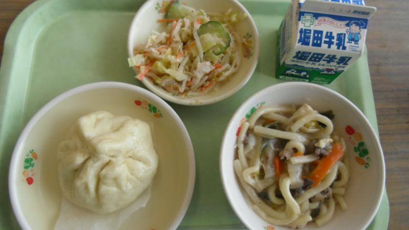 今日の献立は、肉まん、うどんすき、もやしとささみのサラダでした。肉まんは4年生以上はコンビニサイズの既製品の肉まんを蒸して出しました。1~3年の子どもたちには、ちょうど良いサイズのミニ肉まんが商品として無いので、調理場で手作りしました。写真は手作りのものです。生地は小麦粉をはじめ6種の材料、中の肉団子は豚ミンチをはじめ11種の材料が使われ、とっても手が込んだ手作り肉まんです。次回は高学年にも食べてもらえるようにしたいと思います。