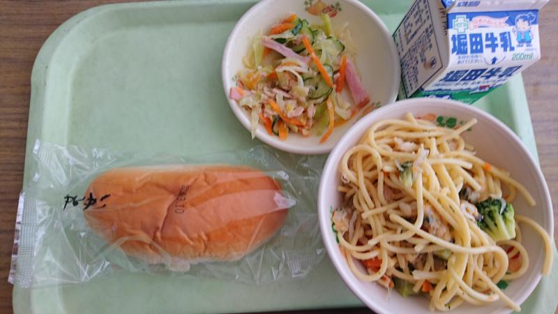 今日の献立は、米粉パン、ミックスうどん、和風サラダ、ヨーグルトでした。米粉パンは、米の消費拡大を目的として、平成21年から学校給食に導入されました。小麦粉のパンよりももちもちとした食感です。