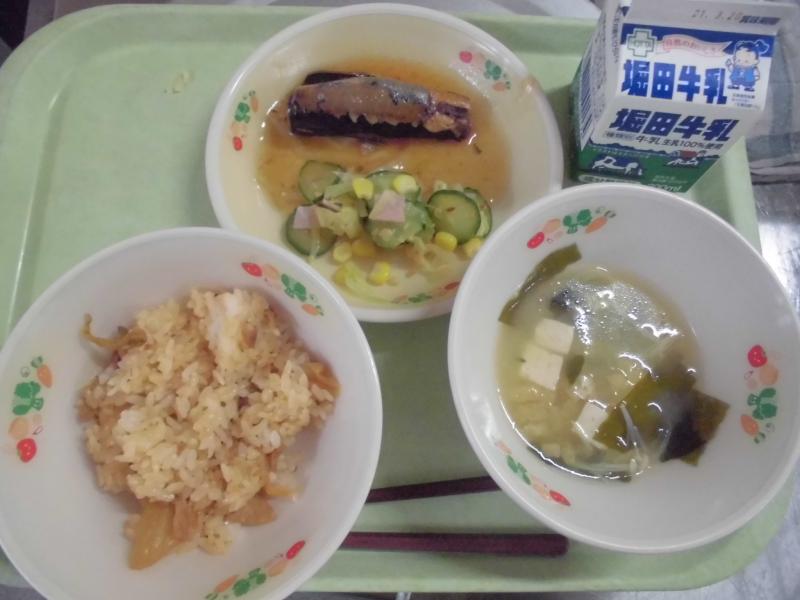 今日の1年生~5年生の献立は、キムチごはん、いわしの生姜煮、ピーナッツ和え、みそ汁でした。