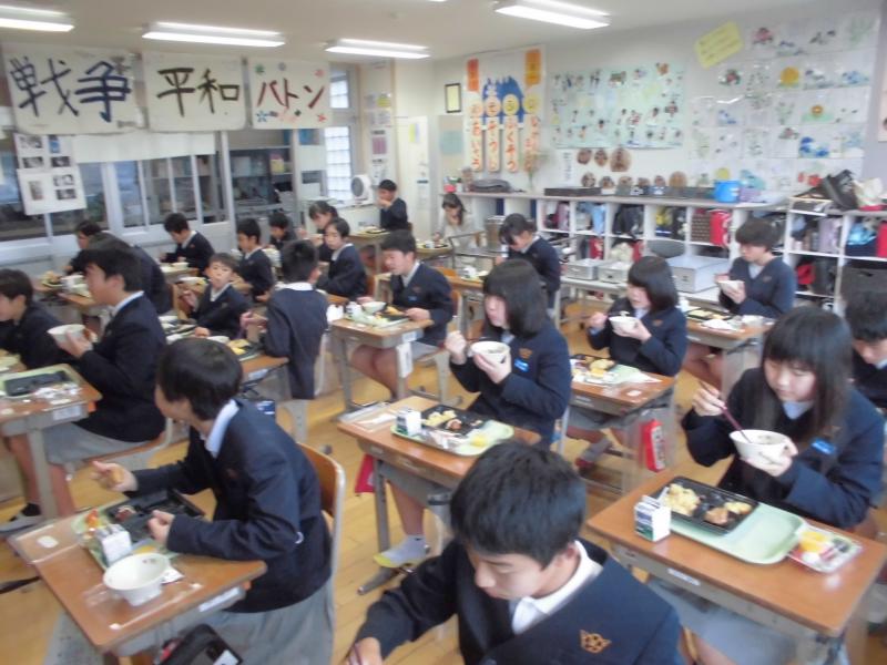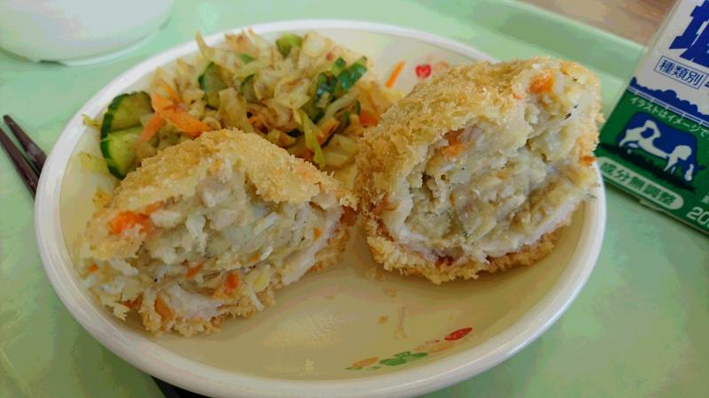 今日の献立は、ごはん、龍砲巻き、かつおあえ、かき玉汁でした。龍砲巻きは、現高2の龍中出身の子どもたちが、中3のときに起業家体験教育の学習の中で考え出したメニューです。「大砲巻き」をアレンジして中の具に龍ヶ岳の特産物「ちりめん」を入れてあります。子どもたちにも大人気でした。