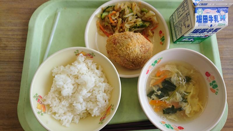 今日の献立は、大豆の香味ごはん、多菜包子、中華きゅうり、わかめスープでした。本日は中華メニュー、大豆たっぷりの混ぜご飯はオイスターソース味です。初登場の多菜包子は餃子に似た感じで、子どもたちにも人気でした。