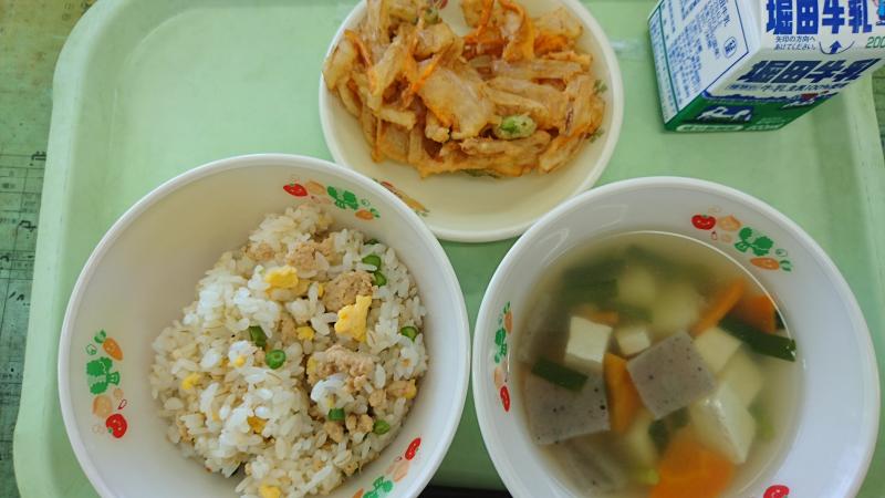 今日の献立は、三色そぼろごはん、新玉ねぎのかき揚げ、五目汁でした。手作りのかき揚げは学年ごとに大きさを変えながら計230個揚げました。新玉ねぎの甘みがよく出ていました。揚げるときにばらけてしまった野菜の破片もおまけに出してあげるときれいに平らげてくれました。