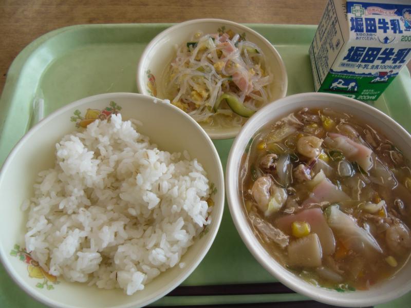 今日の献立は、中華丼、バンサンスーでした。中華あんをかけて丼にして、みんな早く食べあげることができました。酢のものが苦手な子どもたちも、今日のバンサンスーは卵やハム、ゴマ油が入ってまろやかな味になるので大人気です。