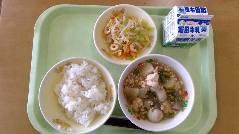 今日の献立は、麦ごはん、さといものそぼろ煮、もやしのごま和えでした。さといもは皮むきがとても大変なので、生のものと冷凍のものを半分ずつ使っています。形がいちょうぎりのものが生、まん丸のきれいな形のものが冷凍でした。違いに気づいた人はいましたか??