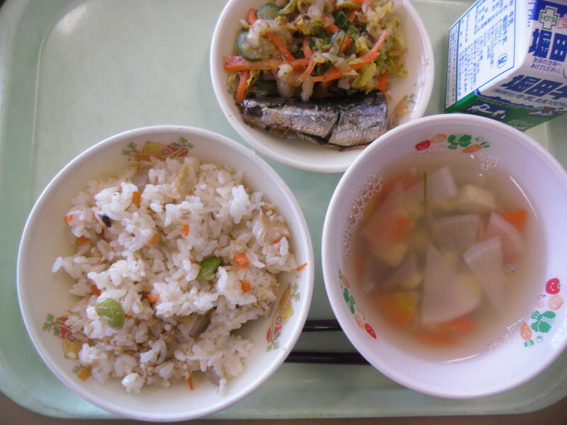 今日の献立は、鶏釜飯、いわしの生姜煮、かつおあえ、けんちん汁でした。今週から、感染拡大予防のために、子どもたちの給食当番は配膳台と学習机の消毒のみを行い、給食の配膳はすべて教職員が行っています。密にならないように、また、最短の時間で完了するように工夫して、スムーズな配食ができています。