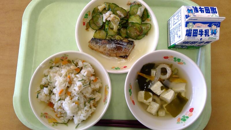 今日の献立は、昆布飯、いわしの生姜煮、きゅうりのおかかあえ、わかめ汁でした。今日のかみかみメニューはおかかあえ、カルシウムメニューは昆布飯といわしです。