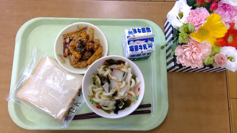 今日の献立は、食パン、わかめうどん、肝っ子竜ちゃんでした。肝っ子竜ちゃん(きもっこたっちゃん)は、使用したレバーの竜田揚げの商品名です。レバーの竜田揚げ、鶏胸肉の唐揚げ、サツマイモフライを甘辛タレでからめました。明日は中体連駅伝!選手の皆さん、レバーパワーで自己ベストが出せますように応援してます!