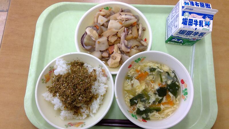今日の献立は、麦ご飯、手作りふりかけ、イカと里芋の煮物、かき玉汁でした。手作りふりかけは、今月のSDGsメニューで、ちりめんの代わりに、今月23日に賞味期限を迎える「煮干し粉」を使いました。煮干しを粉末にしてあり、できあがりは「御飯の友」のような感じになりました。ふりかけ増量の希望者が大勢いました。