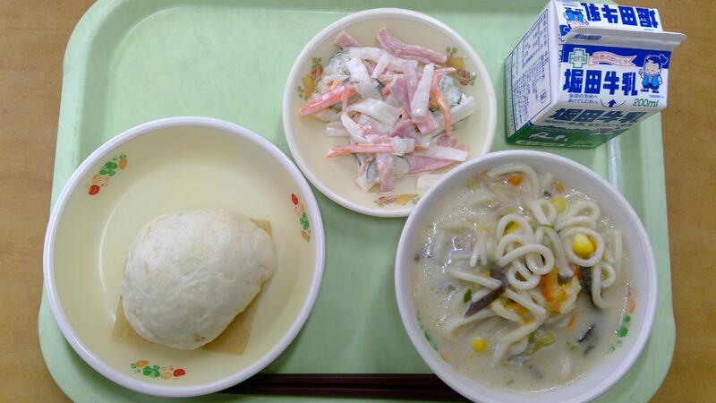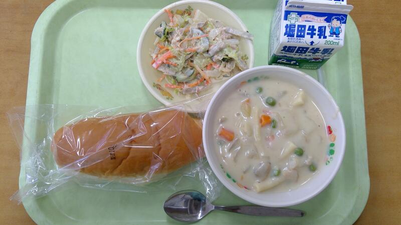 今日の献立は、ミルクパン、クラムチャウダー、ごぼうサラダでした。クラムチャウダーは、あさり貝とエビからだしが出て、手作りのホワイトソースとよく合い、おいしくできました。