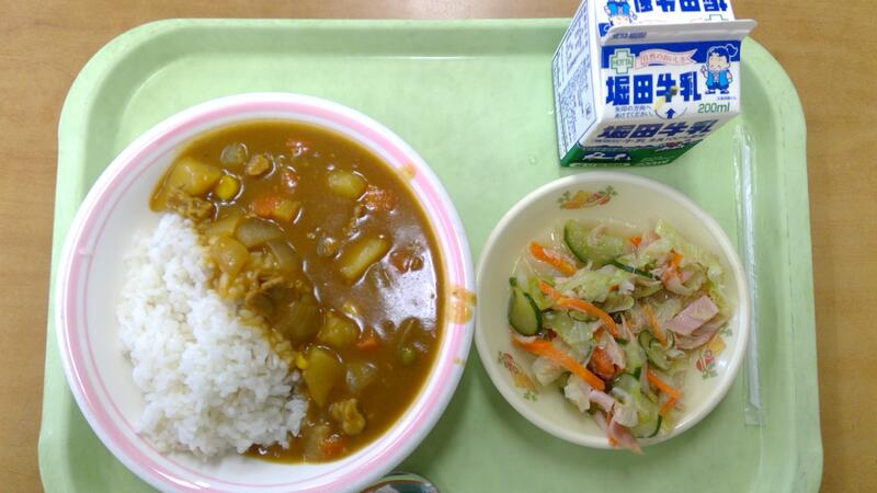 今日の献立は、カレーライス、ツナサラダでした。今日はほぼ全員が時間内に完食することができ、一緒に歯磨きをすることができました。1年生の教室では「毎日カレーだったらみんなが早く食べられていいのにね。」とかわいい感想が聞かれました。また、数名の子どもたちから「昨日の夜ごはんもカレーでした。」「うちは今日の夜カレーです。」という声が聞かれました。ご家庭でも人気のメニューのカレーは、給食とかぶってしまう率が高いですね。