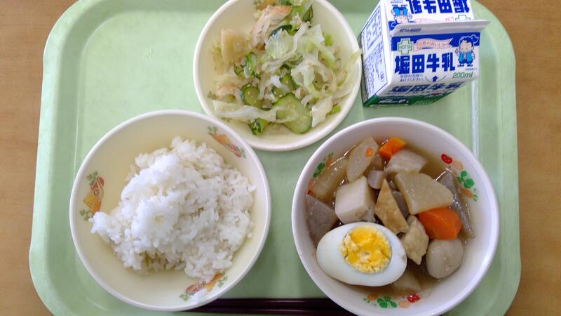 今日の献立は、麦ごはん、おでん、香味和えでした。昨年度から今年度にかけて、色々な食品が値上がりしていますね。子どもたちに人気のうずらの卵もその中のひとつです。そこで今回は鶏卵を煮卵にして2分の1個ずつトッピングとしてつけました。110個のゆで卵の殻をむいて、30分煮込み、取り出して包丁でカットしていく作業は大変でしたが、こんぶ、かつお、いりこのだしがしっかり効いたおでんとよく合いました。