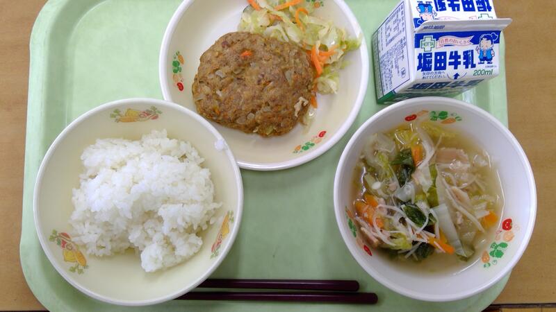 今日の献立は、ごはん、さばバーグ、コールスロー、白菜スープでした。さばバーグは、現中2の子どもたちが家庭科の時間に考案したメニューで、さばの水煮缶詰としぼり豆腐、たまねぎ、にんじん、ごぼうを混ぜたヘルシーなハンバーグです。寒くなってきて温かいスープがおいしい季節になりましたが、今日のスープは野菜とベーコンのうまみがよく出て「おいしい!おいしい!」と子どもたちからも好評でした。