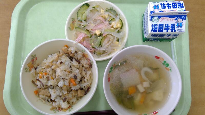 今日の献立は、中華おこわ、バンサンスー、五目スープでした。おこわは、もち米と普通のお米を混ぜて、ちょうど良いもちもちした炊き上がりになりました。子どもたちに大人気の中華サラダ、バンサンスーも「ぼくはこのサラダが1番好きです!」と言ってくれた1年生もいました!