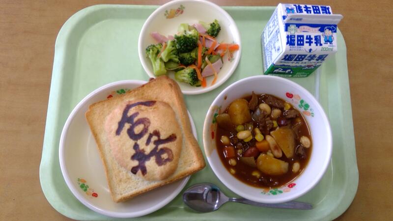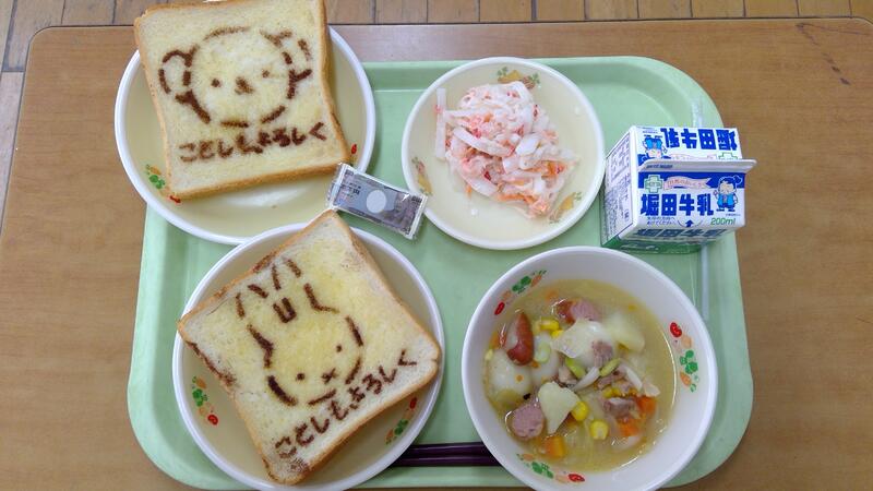 明けましておめでとうございます。今年もどうぞよろしくおね議します。新年初日の給食は、毎年恒例の干支を描いた「年賀状パン」、洋風お雑煮、紅白サラダ、お年玉チョコでした。ミッフィー好きな子どもたちからは「かわいい!」と喜んでもらえました。洋風お雑煮はポトフに白玉餅が入っています。今年もしっかり食べて、強い体を作って元気に学習や運動に取り組みましょう!