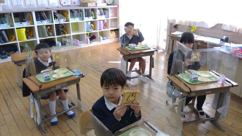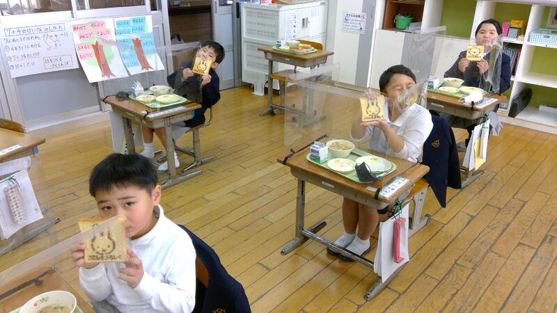 今日の献立は、ごはん、びっくりきんちゃく、ピーナッツ和え、豚汁でした。びっくりきんちゃくは6年生が家庭科の1食分の献立を作成する学習で考案した作品です。中には、餅、ウインナー、ほうれん草、しいたけ、にんじんとたくさんの具材が詰めてあり、とても楽しい福袋のような一品でした。子どもたちは寿司あげをめくって中身を確認し、「うわあー、ウインナーが入っている!」と喜んでいました。