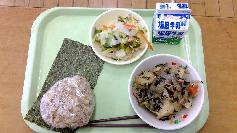 今日の献立は、受験応援食最終日、合格勝つおにぎり、じゃがいもの磯煮、かみかみ和えでした。合格勝つおにぎりは、「受験に勝つ」と「鰹(かつお)」と「おにぎり」の3つの意味がかかったメニューです。昨年度までは、おにぎりの具としてかつお切り身の生姜煮を入れてましたが、不漁のため終売になったとのこと、今回はかつお節としょうゆのおかかおにぎりとしました。本日のおすすめ食材は、のり、ひじき、じゃがいも、のほか、よくかんで食べるさきいかと大豆です。中3の皆さん全員が「桜咲く」となりますように!