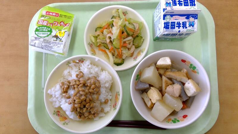 今日の献立は、麦ご飯、湯島大根のおでん風煮、デコポン酢和え、納豆でした。今週は上天草でとれるおいしいものが毎日日替わりで登場します。今日は大矢野町湯島の「湯島大根」です。湯島の頂上の粘土質の赤土で育てられた、湯島大根は大きくてみずみずしく、甘いのが特徴です。今日は18キロの湯島大根を、昆布、かつお節、いりこの3種のだしと調味料で煮込みました。
