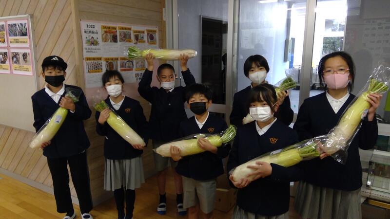↓↓↓給食委員会で湯島大根と記念撮影。立派な大きさに子どもたちもびっくりです。