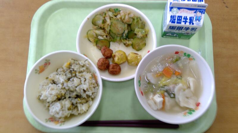 今日の献立は、高菜ご飯、からしレンコンフライ、肉団子、おかかあえ、ちりめんだご汁でした。今日は今月の郷土料理の日でした。からしレンコンは熊本の正月の郷土料理です。手作りするとかなり時間と手間がかかるので、給食では、からしレンコンをみじん切りしたものを丸めてフライにした冷凍食品を使用しました。けっこう辛子がきいていたので、辛いものが苦手な子どもたちはかなり苦戦していましたが、ご飯やだごと一緒に食べて、牛乳で口の中の辛みを消すなどして、工夫して食べていました。