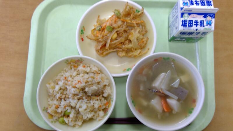 今日の給食は、平成の初め頃からの人気メニューで、こぎつねごはん、たまねぎのかきあげ、けんちん汁でした。こぎつねごはんは、今も昔も大人気の混ぜごはんです。約30年前の大道中では生徒の皆さんが野菜をたくさん育てていて、玉葱がたくさん収穫されたときは、何ヶ月もお店に注文せずに済み、玉葱をたっぷり使ったメニューがよく出されたそうです。