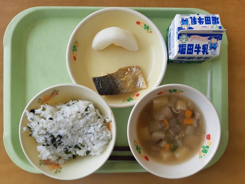 9月20日(水) わかめご飯、牛乳、塩サバ、つぼん汁、梨