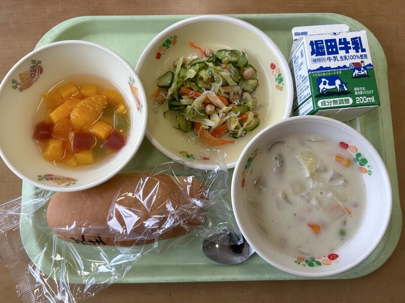 コッペパン、牛乳、冬野菜クリームシチュー、じゃこ豆サラダ、フルーツポンチ