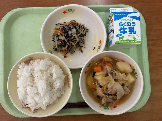12月9日(月)麦ごはん、牛乳、キムチ肉じゃが、白菜とひじきの和え物