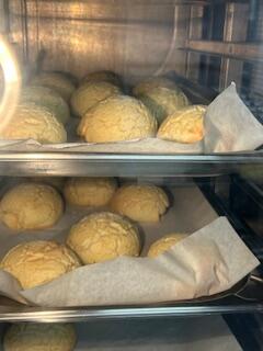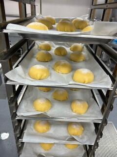 今日は小学生が楽しみにしていた手作りメロンパンを実施しました。130個のメロンパンを3人の調理員さんと作りました。