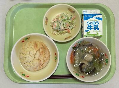 12月19日(木)ココアパン、牛乳、冬野菜クリームシチュー、さつまいもサラダ