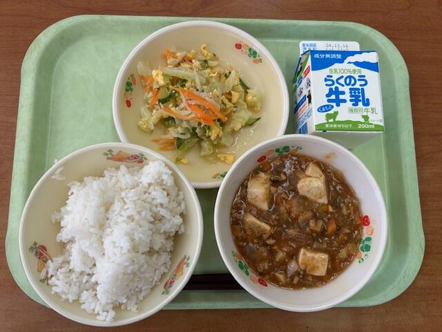 12月3日(火)麦ごはん、牛乳、豆入り麻婆豆腐、いり卵のごま酢和え