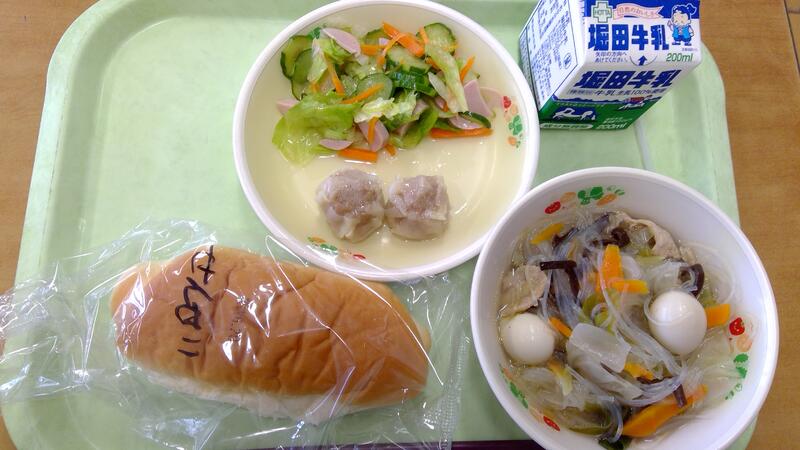 今日の献立は、ミルクパン、タイピエン、肥後しゅうまい、中華サラダでした。タイピエンは熊本の郷土料理です。初登場の「肥後しゅうまい」は、熊本県学校給食会の商品開発チームで新規開発されたもので材料の産地に県産や九州産の物が使われています。1年生の子どもたちの中には、大好きなしゅうまいを最後に残して味わって食べている人がたくさんいました。