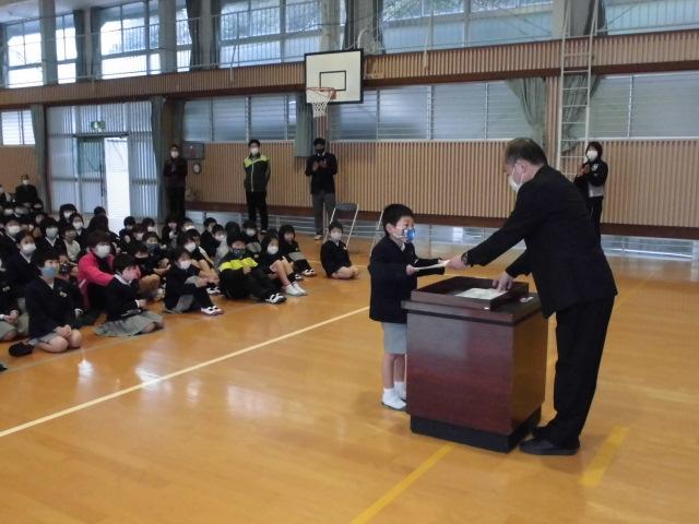 今日は全校集会がありました。11月に行われた「熊日学童スケッチ展」、11月から1月にかけて行われた「上天草市読書マラソン」、天草郡市小体連主催の長縄チャレンジの表彰がありました。