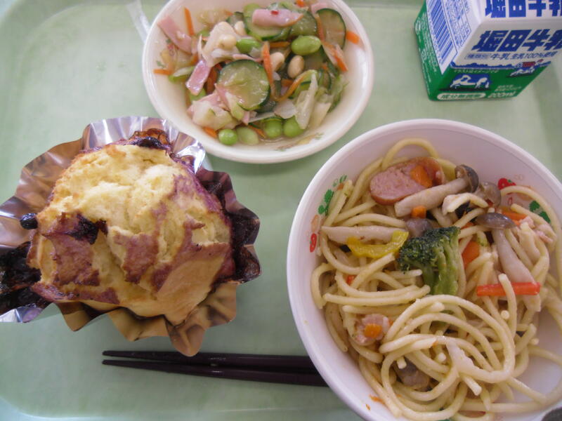 今日の献立は、ブルーベリーマフィン、カラフルスパゲティ、ビーンズサラダでした。10月10日は目の愛護デー、目にいいアントシアニンを含むブルーベリー、ビタミンAを含む緑黄色野菜を取り入れたメニューです。ブルーベリー苦手さんが数名見られましたが、焼きたてほやほやのマフィンをおいしそうにほおばっていました。
