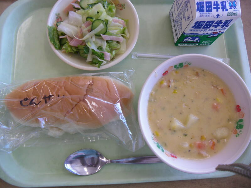 今日の献立は、ミルクパン、コーンポタージュ、レタスサラダでした。