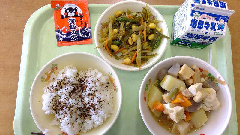 教の献立は、麦ごはん、うま煮、かみかみカレーきんぴら、御飯の友でした。今日のかみかみメニューは副菜のきんぴらです。ごぼう、くきわかめ、大豆をしっかりよくかんで食べることができました。