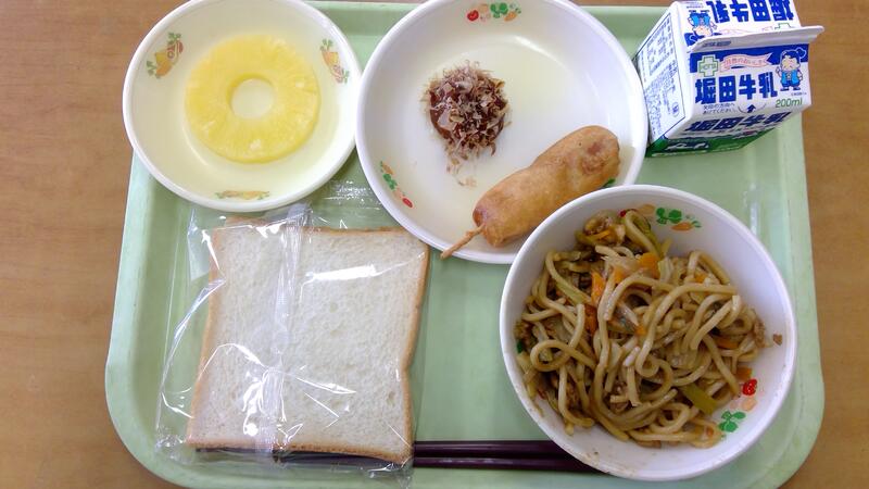 今日の献立は、食パン、焼きそば、プチドッグ、たこ焼き、アイスパインでした。テーマはお祭りです。ここ数年コロナ禍で地域のお祭りも中止となっている中、給食で少しでもお祭り気分を味わってもらえたらと思います。