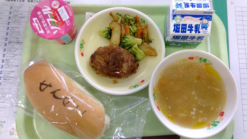 今日の献立は、コッペパン、ハンバーグ和風ソース、三色付け添え野菜、コンソメスープ、ソフールヨーグルトでした。手作りの和風ソースはおろし玉葱とおろしにんにくをしょうゆ、酒、砂糖、酢、みりんで煮込んで作ります。その日の玉葱の辛み次第で出来上がりが違ってくるのですが、今日は辛みの少ない良い玉葱でおいしくできました。