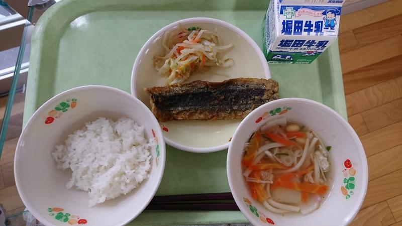 今日の献立は、ごはん、さんまの蒲焼き、もやしのごまあえ、うどん汁でした。旬のさんまは開きにして粉をまぶしたものを揚げ、しょうが醤油のたれにからめました。長くてお皿からはみ出るくらい大きかったです。