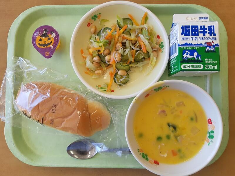 10月31日(火)ミルクパン、牛乳、パンプキンシチュー、じゃこ豆サラダ、ハロウィンゼリー