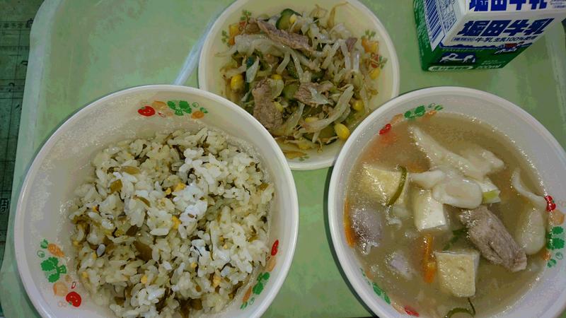 今日の献立は、高菜ごはん、天草大王だご汁、黒毛和牛のポン酢和えでした。県からの提供食材は、天草大王とくまもと黒毛和牛です。